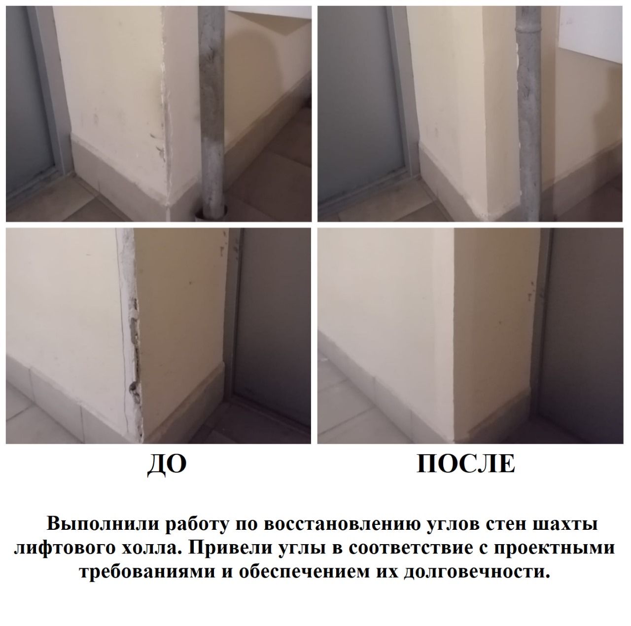Выполнили работу по восстановлению углов стен шахты лифтового холла