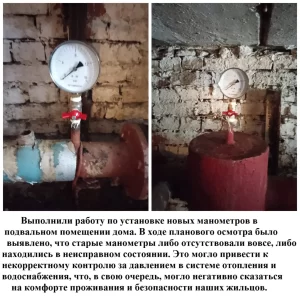 Выполнили работу по установке новых манометров в подвальном помещении дома