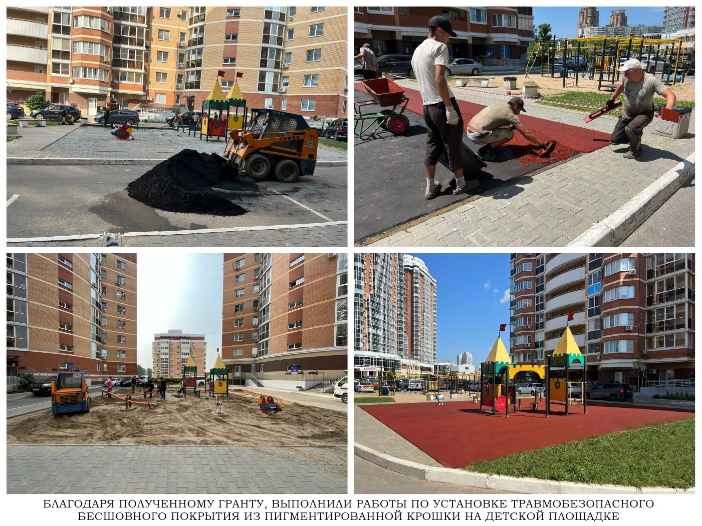 Благодаря полученному гранту выполнили работы по устройству травмобезопасного бесшовного покрытия из пигментированной резиновой крошки на детской площадке